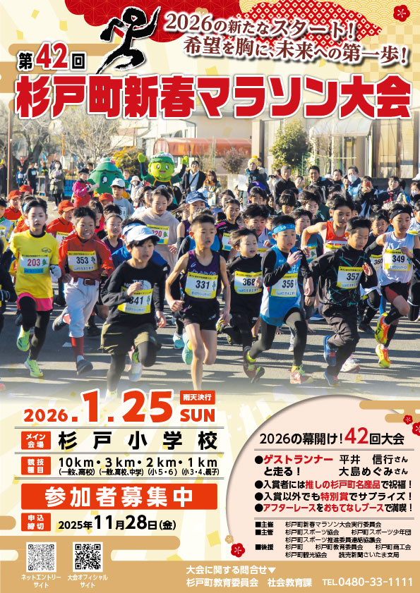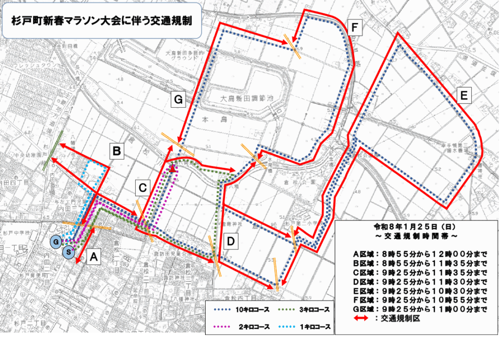 令和8(2026)年1月25日(日)に開催する「第42回杉戸町新春マラソン大会」に伴い、一部の道路において交通規制を実施い たします。ご迷惑をお掛け致しますが、皆様のご理解とご協力をよろしくお願いします。